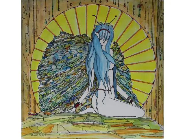 Surrealist combined with automatic watercolor and ink painting. A witch sitting in the dark lit only by the pale light of the crescent moon on which she sits. Within her the dark is replaced with color and intertwined thoughts moving out in all directions.