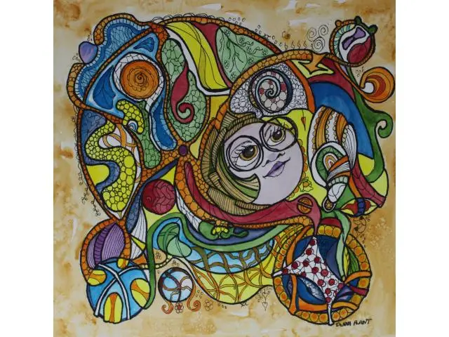 A blend of surrealism and automatic painting. 12 x 12 varnished watercolour and ink on Appollen Birch back board. The bespectacled (glass wearer) with a mind full of colour and pattern. conveys the random thought process that is constantly swirling around in our minds behind our eyes.