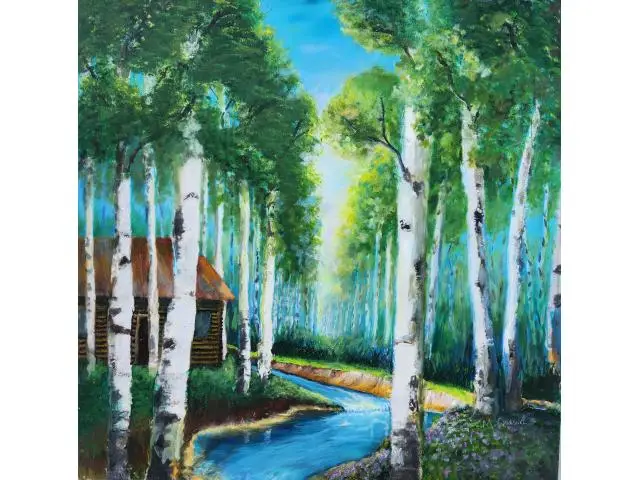 A serene landscape depicted through vibrant colors showcases a log cabin nestled among tall, slender birch trees. A gentle stream meanders past the cabin, reflecting the blues and greens of the surrounding foliage and sky.