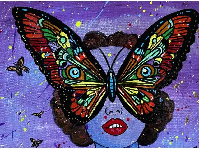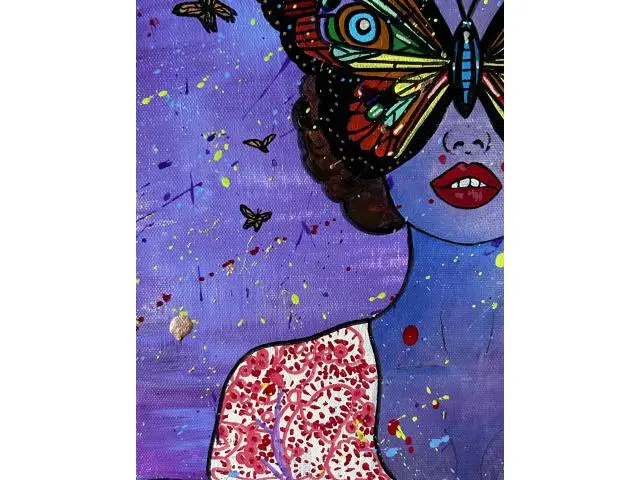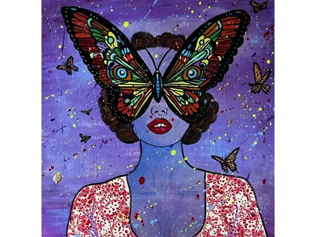This is an original acrylic painting by Melissa Jeaurond. It depicts a woman who is surrounded by butterflies set against a purple sky. Her eyes are hidden behind the wings of a large butterfly. It is a mix of surrealism and pop art styles. The main colors are various shades of purple, red and blue. The woman's skin is painted with an iridescent paint which changes slightly from blue to purple depending on the angle of viewing.