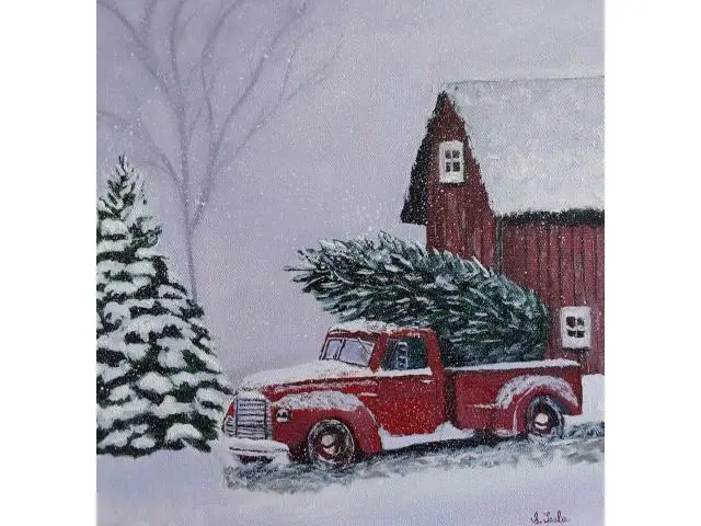 This cozy winter scene captures the heart of the holidays — a red pickup truck carrying home a fresh Christmas tree, parked beside a rustic barn and dusted with new-fallen snow. The painting has a timeless, nostalgic feel, reminding us of simple traditions and the joy of the season.