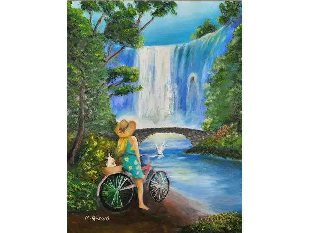 A person in a hat and dress with a bicycle is looking towards a large waterfall that cascades over a cliff, beneath which is a stone bridge over a serene river. Trees and greenery frame the scene, contributing to a peaceful, natural atmosphere, and a bird is seen taking flight from near the bridge. A Snowshoe Siamese cat is sitting in the basket at the back of the bike.