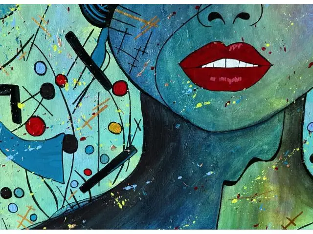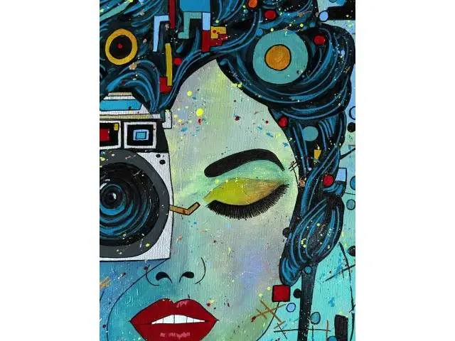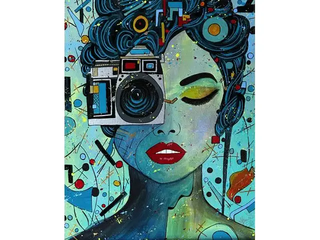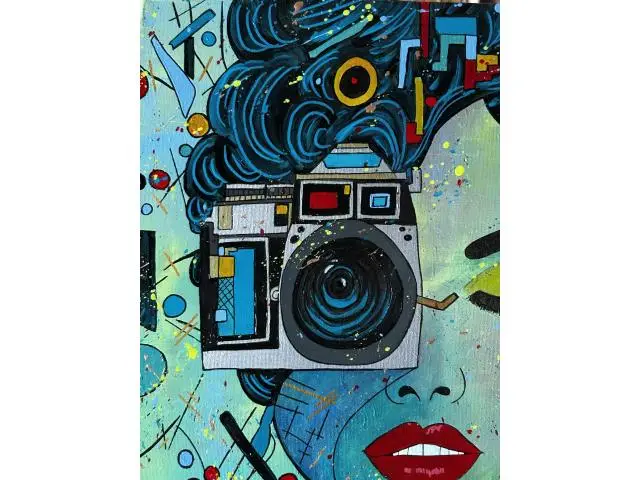 This is an original acrylic painting by Melissa Jeaurond. It depicts a woman who's face is half human, half machine. One of her eyes is a camera which gives her the ability to photograph everything she sees. It is a mix of surrealism and pop art styles. The main colors are various shades of blue, green, and black. The woman's skin is painted with an iridescent paint which changes slightly from blue to purple depending on the angle of viewing.