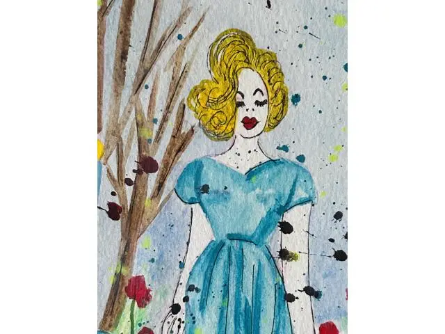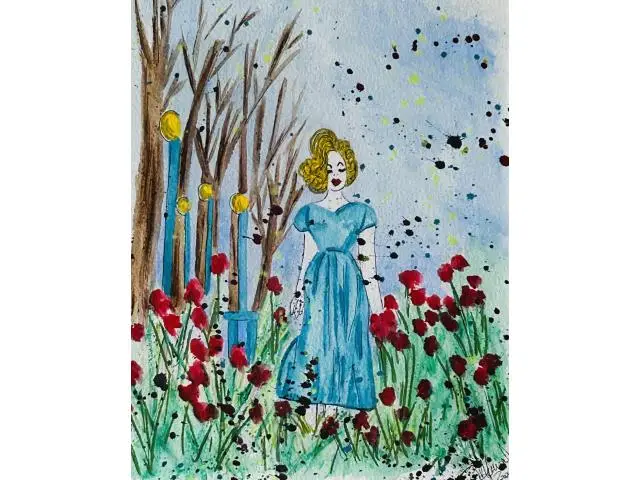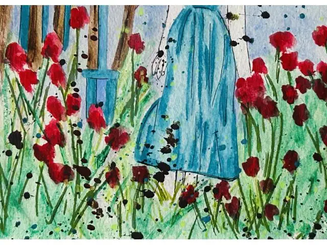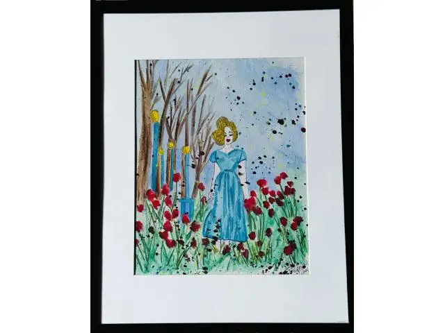 Search Tags by Artist watercolor, ink, painting, landscape, woman, girl, female, walking, blue dress, spring, flowers, garden, red, blue, original, unique, serene