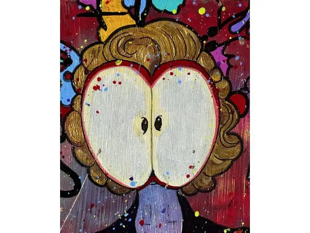 This is an original acrylic painting by Melissa Jeaurond. It depicts a woman who's face is the inside of an apple. She is wearing a retro 1950's style dress and hairdo, while standing in front of a graffiti / abstract red wall. It is a mix of surrealism and pop art styles. The main colors are various shades of red, orange, purple & yellow. The woman's skin is painted with an iridescent paint which changes slightly from blue to purple depending on the angle of viewing.